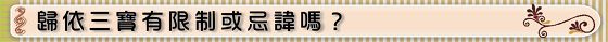 如果在学道的旅程,每个人都能禀持这客观态度,那么佛教慈悲之门,永远都是开着,随时欢迎六道众生,为善为恶的浪子,一切宗教者的回头,来正见如来,肯定如来的正法,因而归依佛门,早离苦海,速证菩提,既然已发心恳切要学佛了,那么心里上的一切执着与成见,皆可一扫而空,爽快俐落,心中无有一物,以清净虔诚的一片心,就可以足够受三归依了,所以说,归依三宝并没有限制我们什么!更无忌讳什么!
